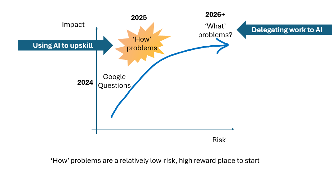 Most leaders assume the goal of AI is to delegate their work to machines – to get AI to forecast, analyse, or write reports. I call these ‘what’ problems. In the long run, yes this is the goal, but currently there are two key reasons ‘what’ problems are not really viable for AI to solve in 2025.